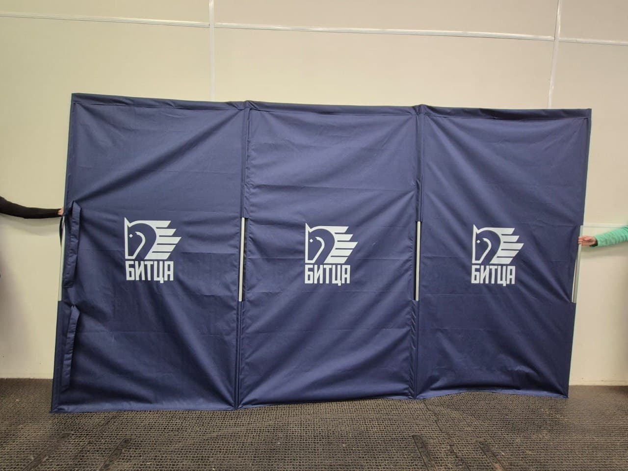 Ширма ветеринарная для использования при проведении официальных соревнований по конному спорту. Ширма используется ассистентами в случае экстренной ситуации с лошадью на поле - чтобы оперативно закрыть ее от зрителей на время экстренных ветеринарных манипуляций. Ширма может быть изготовлена любого цвета. За дополнительную стоимость возможног нанесение логотипа т(обсуждается отдельно).