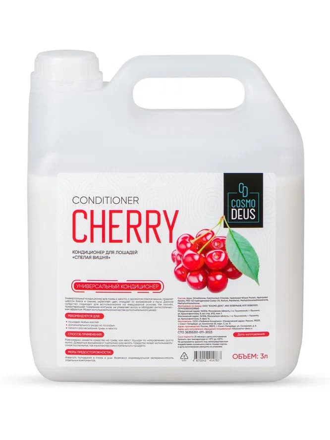 Универсальный кондиционер для гривы и хвоста, с ароматом спелой вишни, придает шерсти блеск и сияние, укрепляет цвет, очищает от загрязнений и пыли. Данное средство подходит для использования на ежедневной основе. Не липнет, предотвращает появление колтунов, не утяжеляет волос и обладает антистатическим эффектом. Может использоваться в качестве дополнительного ухода. Рекомендуется для: — лошадей любых мастей; — дополнительного ухода за лошадью; — легкого расчёсывания гривы и хвоста. Способ применения: Равномерно нанести средство на гриву, или хвост лошади по направлению роста волос. Дождаться высыхания и тщательно расчесать. Средство может использоваться как после мытья, так и в качестве самостоятельного продукта. Меры предосторожности: избегать попадания в глаза и уши. Возможна индивидуальная непереносимость отдельных компонентов.