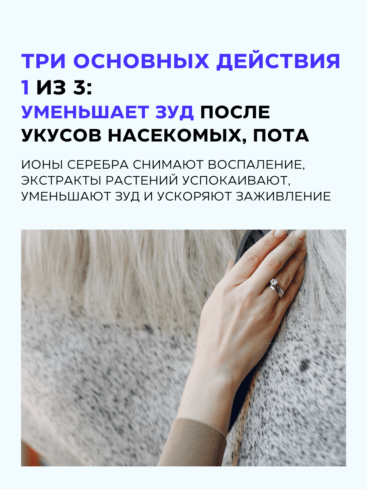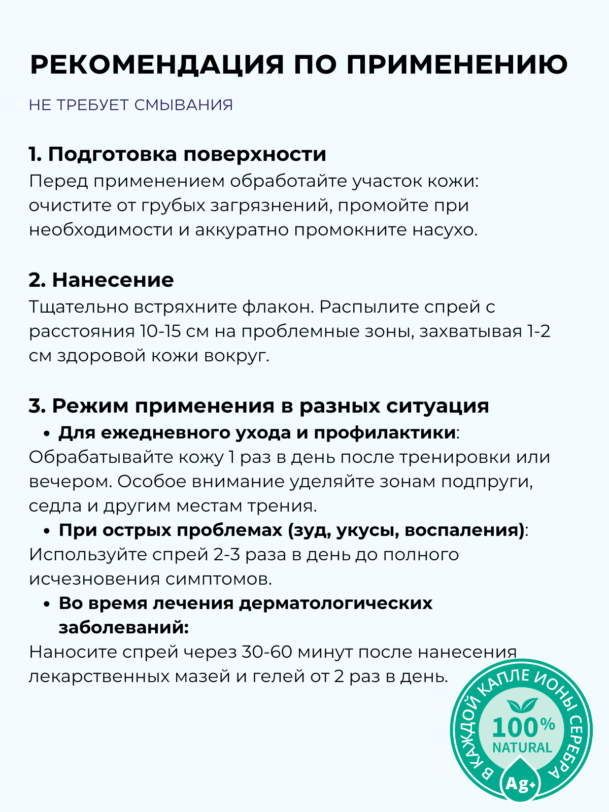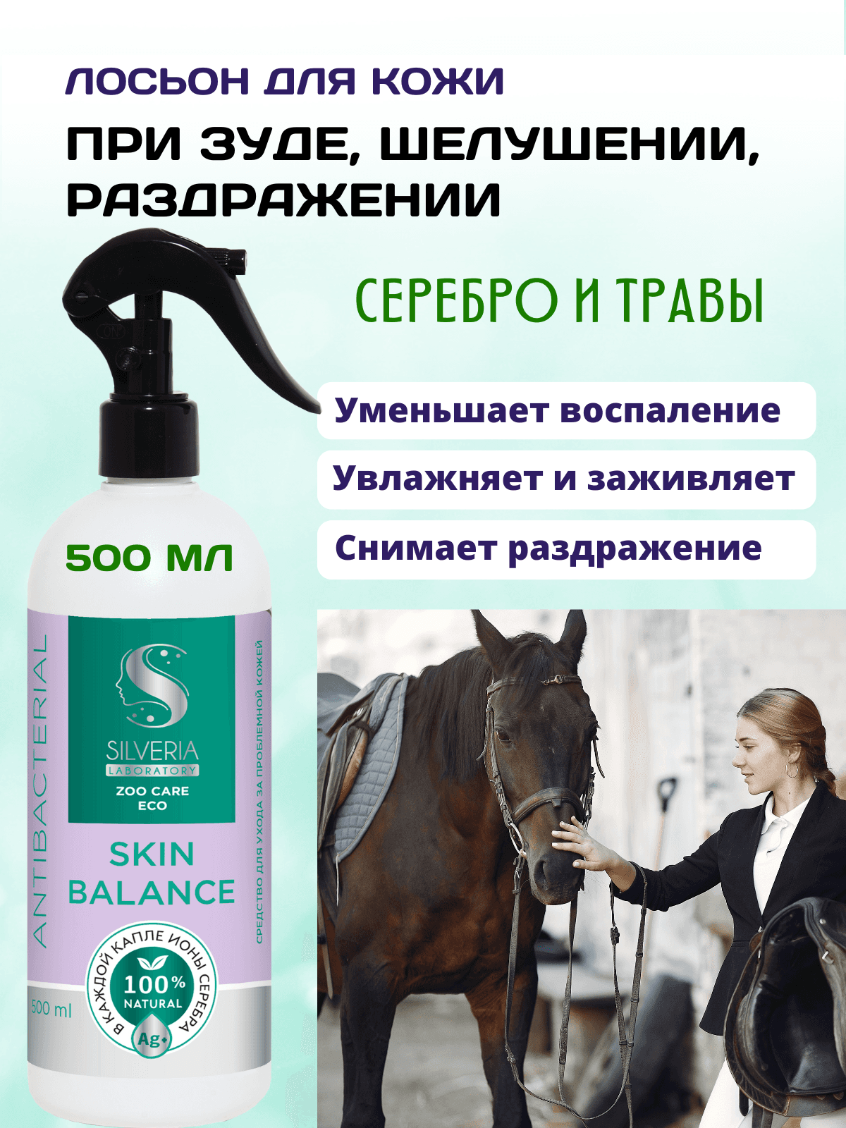 Спрей при зуде и шелушении для лошадей Skin Balance - это натуральное средство с ионами серебра и экстрактами трав, разработанное специально для ухода за раздраженной и зудящей кожей животных. Формула спрея быстро снимает покраснение и зуд у лошадей после укусов слепней, комаров и мошек, предотвращая расчесы и воспаление. Этот гипоаллергенный лосьон для кожи лошадей обладает увлажняющим и заживляющим эффектом, идеально подходит для лошадей с сухой и раздраженной кожей. Он целенаправленно борется с раздражением, шелушением и покраснением, в том числе после укусов насекомых, обеспечивая мгновенное охлаждающее действие и комфорт для животного. Лосьон Skin balance не является лекарством, при этом может использоваться для во время лечения зуда и аллергии у животных, в том числе вызванной реакцией на укусы. Идеальный выбор для грумеров, коневладельцев и всех, кто заботится о здоровье кожи своих питомцев. Пригоден для лошадей с проблемной кожей. Он предназначен для лошадей всех пород и возрастов, и подходит для чувствительной кожи. Используется для обработки чувствительных и наиболее уязвимых зон, таких как грива, холка, живот и подпруга. Лосьон также рекомендуется ветеринарами для регулярных и ежедневных процедур, особенно летом. Количество применений не ограничено и безопасно для животного благодаря натуральным компонентам. Идеальный антисеборейный лосьон при перхоти у лошадей. Silveria - это российский бренд средств с ионами серебра для ухода за кожей. Главной особенностью каждого товара является полностью натуральный состав: без спирта, силиконов, гормональных и других подобных средств.