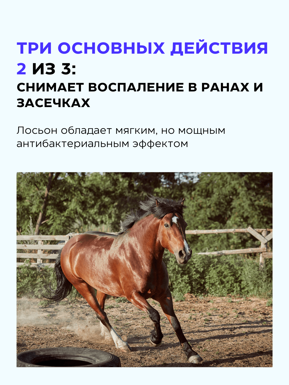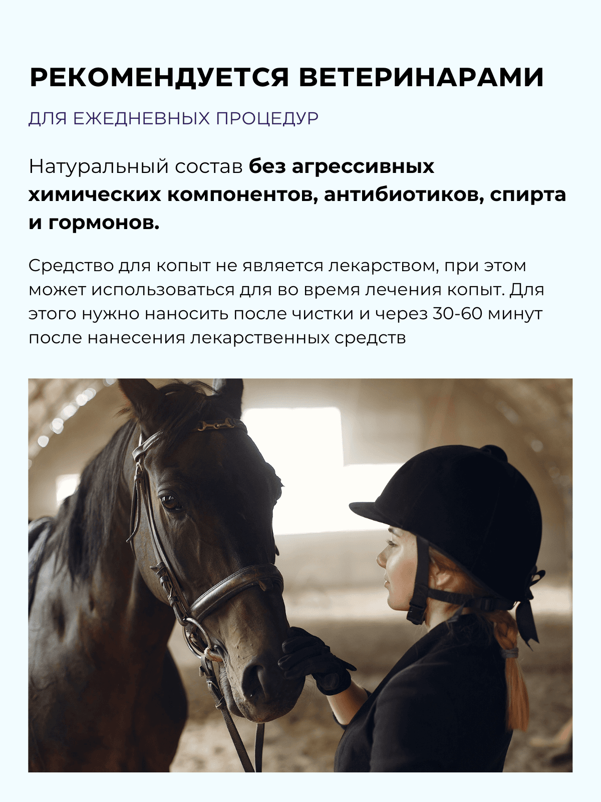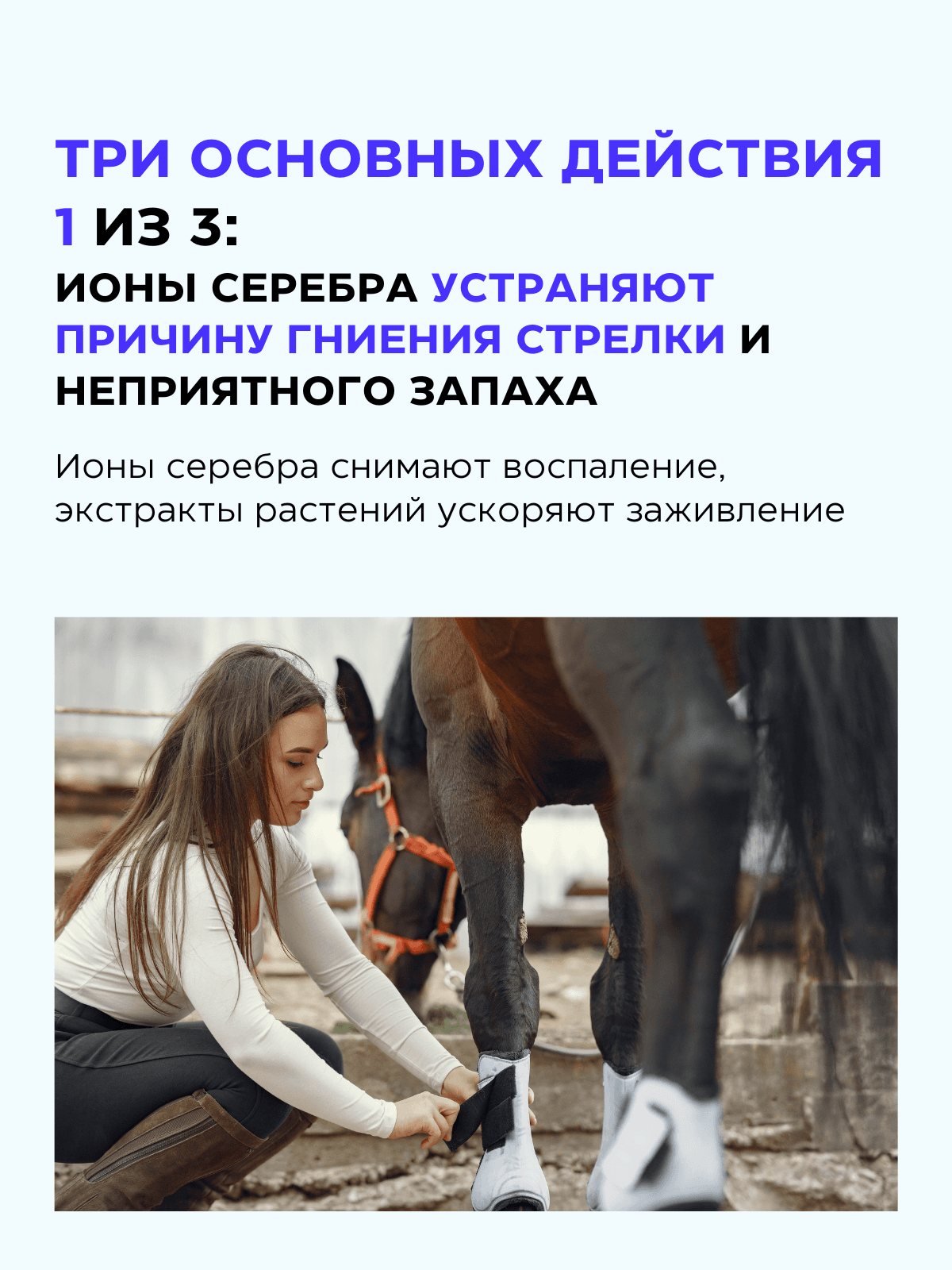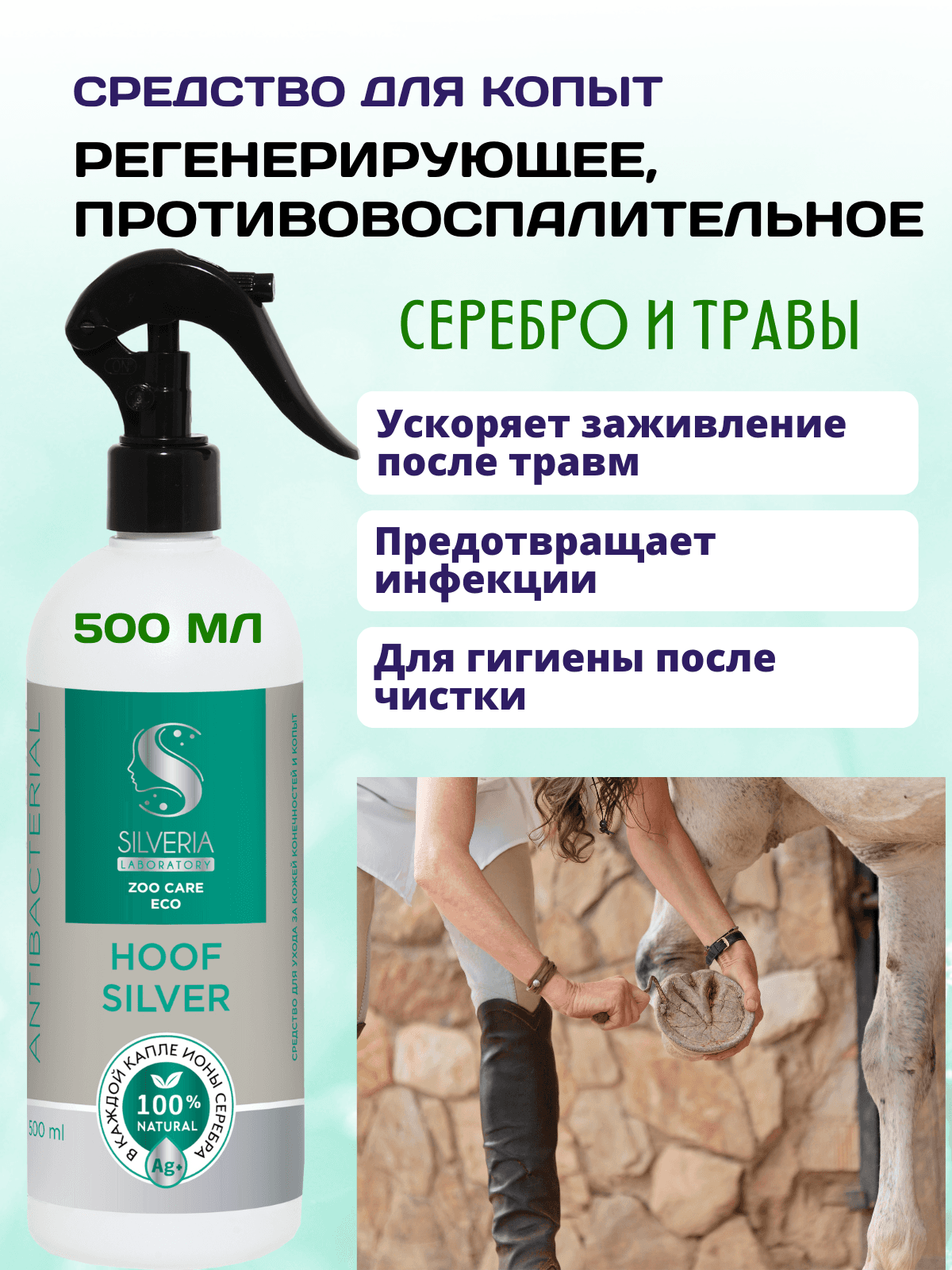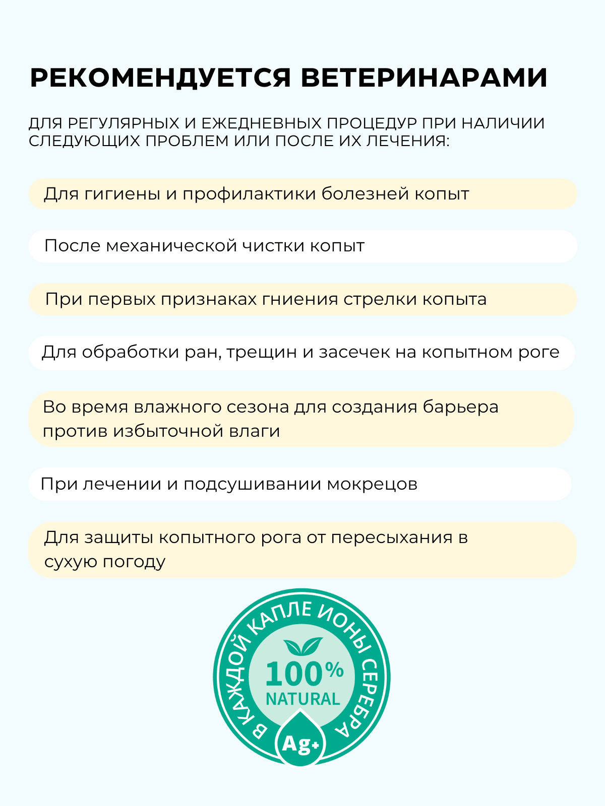 Натуральный спрей для копыт лошадей — профессиональное средство для копыт лошадей, обеспечивающее комплексную обработку копыт лошадей. Эффективное средство предотвращающее гниение стрелки копыта, борется с бактериями и грибками. Надежное средство для ран и засечек копыт мягко обеззараживает повреждения и ускоряет восстановление тканей. При регулярной обработке стрелки копыта средство создает защитный барьер, предотвращающий развитие инфекций. Это мощное противогрибковое средство для копыт лошадей и эффективный антибактериальный спрей для копыт, который подходит для ежедневного использования благодаря безопасному составу. Противовоспалительное средство для копыт снимает покраснение и отек, и регенерирует ткани, стимулируя заживление. Незаменимое для гигиены копыт лошади, средство обеспечивает полноценный ежедневный уход за копытами. Идеально для профилактики болезней копыт при регулярном применении 3-4 раза в неделю. После чистки и обработки копыт спрей наносится во все труднодоступные области, обеспечивая полную защиту. Рекомендации по применению: после механической очистки копыт равномерно распылите средство на всю поверхность, уделяя особое внимание стрелке и труднодоступным зонам. Для профилактики используйте 3-4 раза в неделю, при наличии проблем — 1-2 раза в день до полного устранения симптомов. Защищает копытный рог от бактериальной и грибковой микрофлоры. Препятствует пересыханию копытного рога. Silveria - это российский бренд средств с ионами серебра для ухода за кожей. Главной особенностью каждого товара является полностью натуральный состав: без спирта, силиконов, гормональных и других подобных средств.