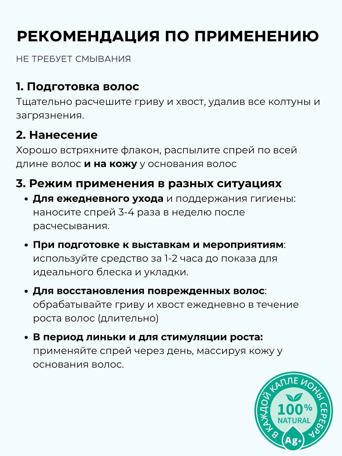 Восстанавливающий спрей-кондиционер для роста здоровых и густых волос и блеска гривы и хвоста - мощное оздоровление на уровне волосяного фолликула для густой и здоровой гривы. Silk mane — это кондиционер, который работает не только с волосом, но и с его основой. В отличие от обычных кондиционеров, он действует на уровне волосяного фолликула, обеспечивая глубокое восстановление и стимулируя активный рост волос. Улучшает кровообращение и питание волосяного фолликула, насыщая витаминно-минеральным комплексом. Спрей для роста гривы и хвоста — это профессиональный уход, который заметен по результату. Как работает: - Стимулирует рост и пробуждает луковицы (без гормональных компонентов, полностью натуральный!), улучшает микроциркуляцию крови и насыщает волосяные фолликулы витаминно-минеральным комплексом, оказывая выраженное стимулирующее действие на рост гривы и хвоста. - Борется с перхотью и зудом: благодаря ионам серебра и экстракту крапивы средство эффективно борется с перхотью у лошадей, нормализуя микрофлору кожи. - Спрей для гривы и хвоста при нанесении на кожу глубоко проникает в структуру волоса, возвращая ему прочность, упругость и естественный баланс увлажненности. Защищает от патогенных бактерий и грибков. - Придает безупречный вид: при нанесении на длину волос кондиционер для блеска гривы и хвоста облегчает расчесывание, предотвращает сухость и ломкость, даря волосам упругость и живой блеск. Идеален для подготовкой гривы к выставке. Ионы серебра: обеспечивают антибактериальную защиту, устраняют раздражение после шампуня, восстанавливают здоровый баланс кожи. Экстракт крапивы: стимулирует кровообращение, пробуждая спящие волосяные луковицы и укрепляя корни. Комплекс экстрактов (лист оливы, проростки пшеницы): глубоко питает и насыщает волосы витаминами, защищая от ломкости и сухости, обеспечивая интенсивное восстановление по всей длине. Применение: Нанесите спрей на кожу у основания волос, а затем по всей длине гривы и хвоста после мытья, во время ежедневного ухода или для подготовки к мероприятиям. Подходит для регулярного использования. Silveria - это российский бренд средств с ионами серебра для ухода за кожей. Главной особенностью каждого товара является полностью натуральный состав: ионы серебра и экстракты растений. Подарите вашей лошади роскошную, густую гриву и хвост с профессиональным уходом!