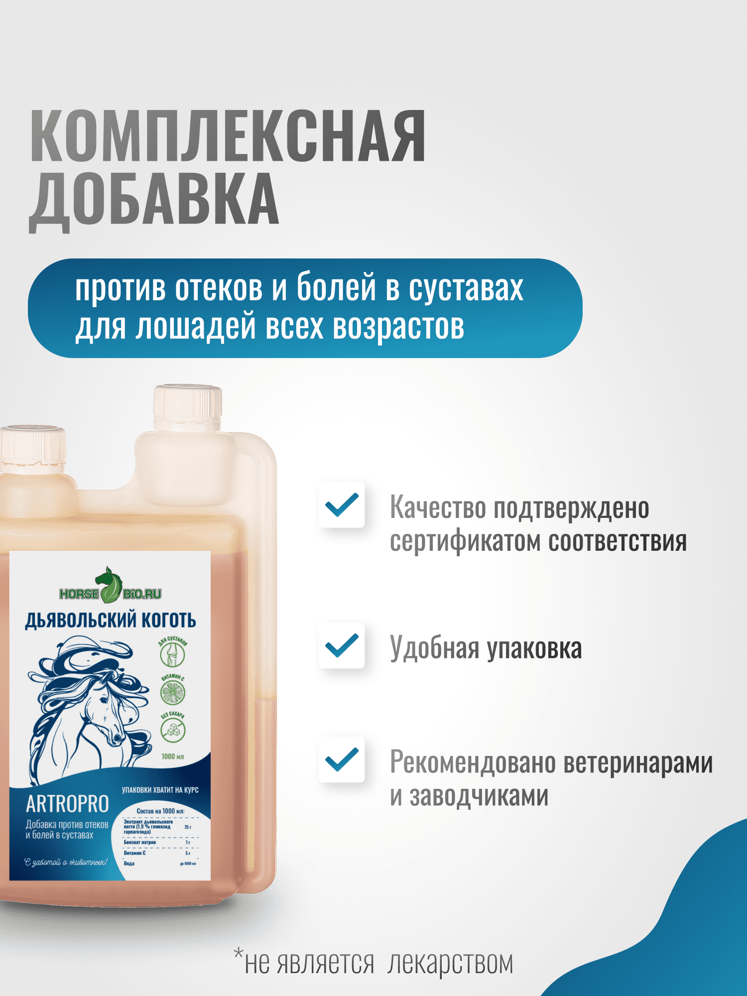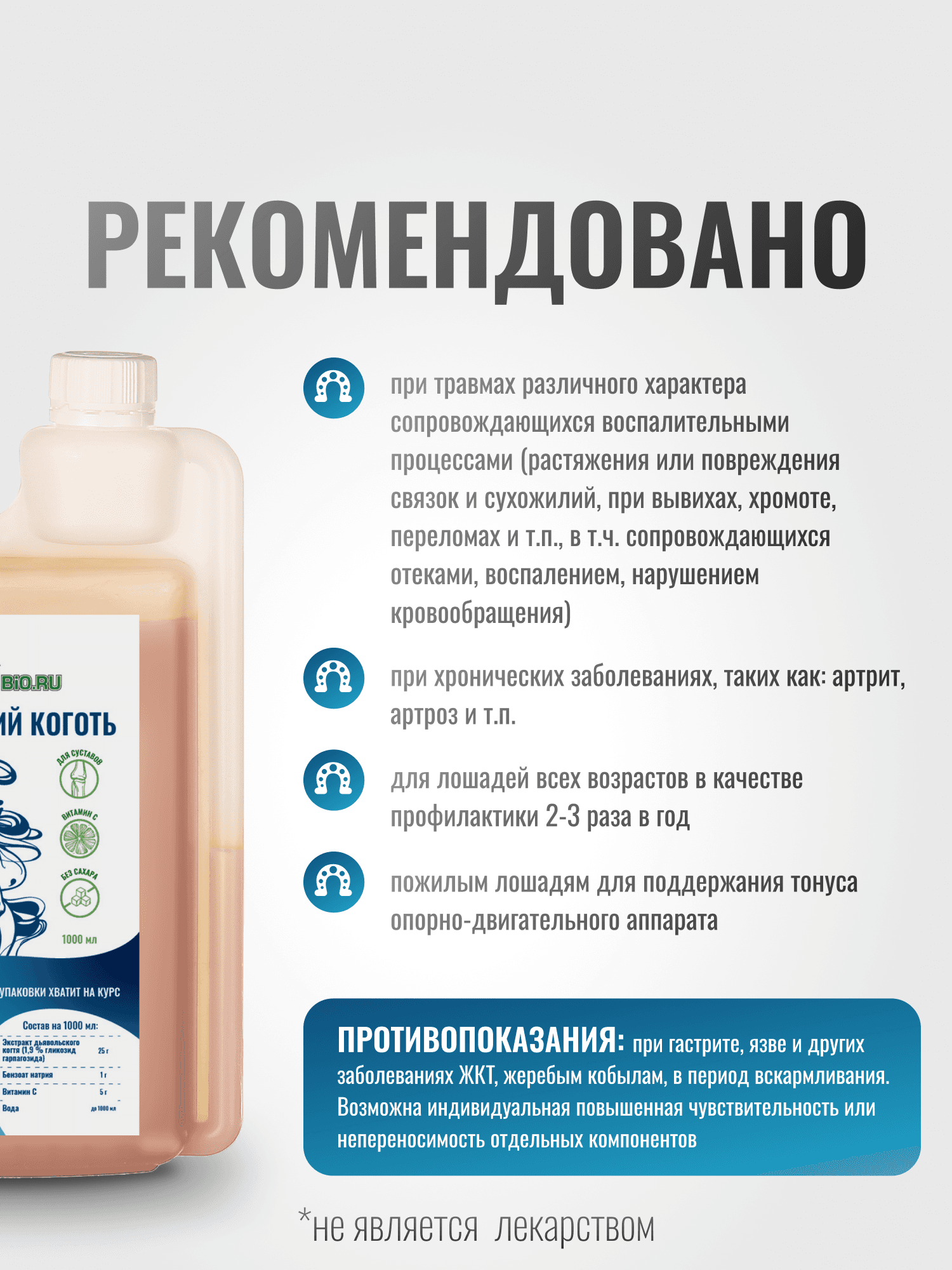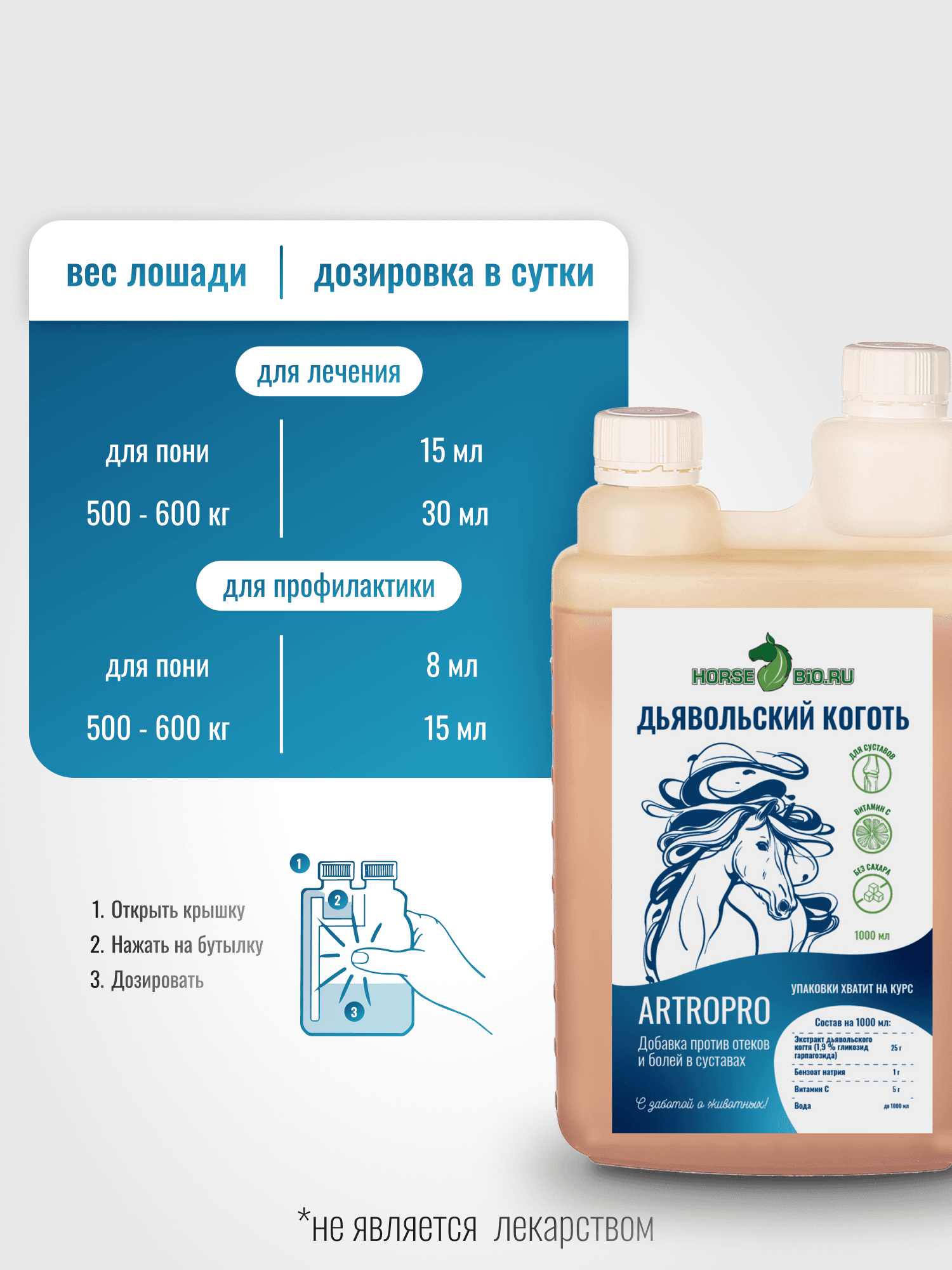 Эликсир ДЬЯВОЛЬСКИЙ КОГОТЬ с витамином С — это высококачественная кормовая добавка, разработанная специально для лошадей с противовоспалительным действием. Объем упаковки составляет 1000 мл, что удобно для длительного использования. Рекомендовано спортивным и рабочим лошадям, а также животным в период реабилитации после травм. Главное действующее вещество, содержащееся в экстракте дьявольского когтя способствует снятию воспаления и болей, поддержанию гибкости суставов и легкости движений. Витамин С, содержащийся в формуле, способствует укреплению иммунной системы, что особенно важно в условиях повышенных нагрузок и стрессов. Применение данной кормовой добавки помогает поддерживать хорошую подвижность суставов и общую активность животных. Эликсир легко дозируется и может быть добавлен в привычный корм, что делает его использование максимально комфортным. Кормовая добавка не содержит искусственных красителей и консервантов, что обеспечивает высокую безопасность для здоровья ваших лошадей. Оптимальная формула помогает эффективно справляться с воспалительными процессами и улучшает общее состояние вашего животного. Если вы заботитесь о здоровье и благополучии своих лошадей, тогда Эликсир ДЬЯВОЛЬСКИЙ КОГОТЬ с витамином С станет незаменимым помощником в этом деле. Его регулярное применение поможет сохранить бодрость и здоровье ваших лошадей.