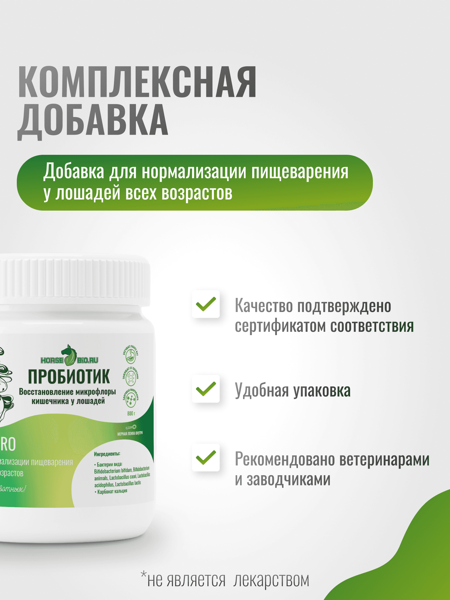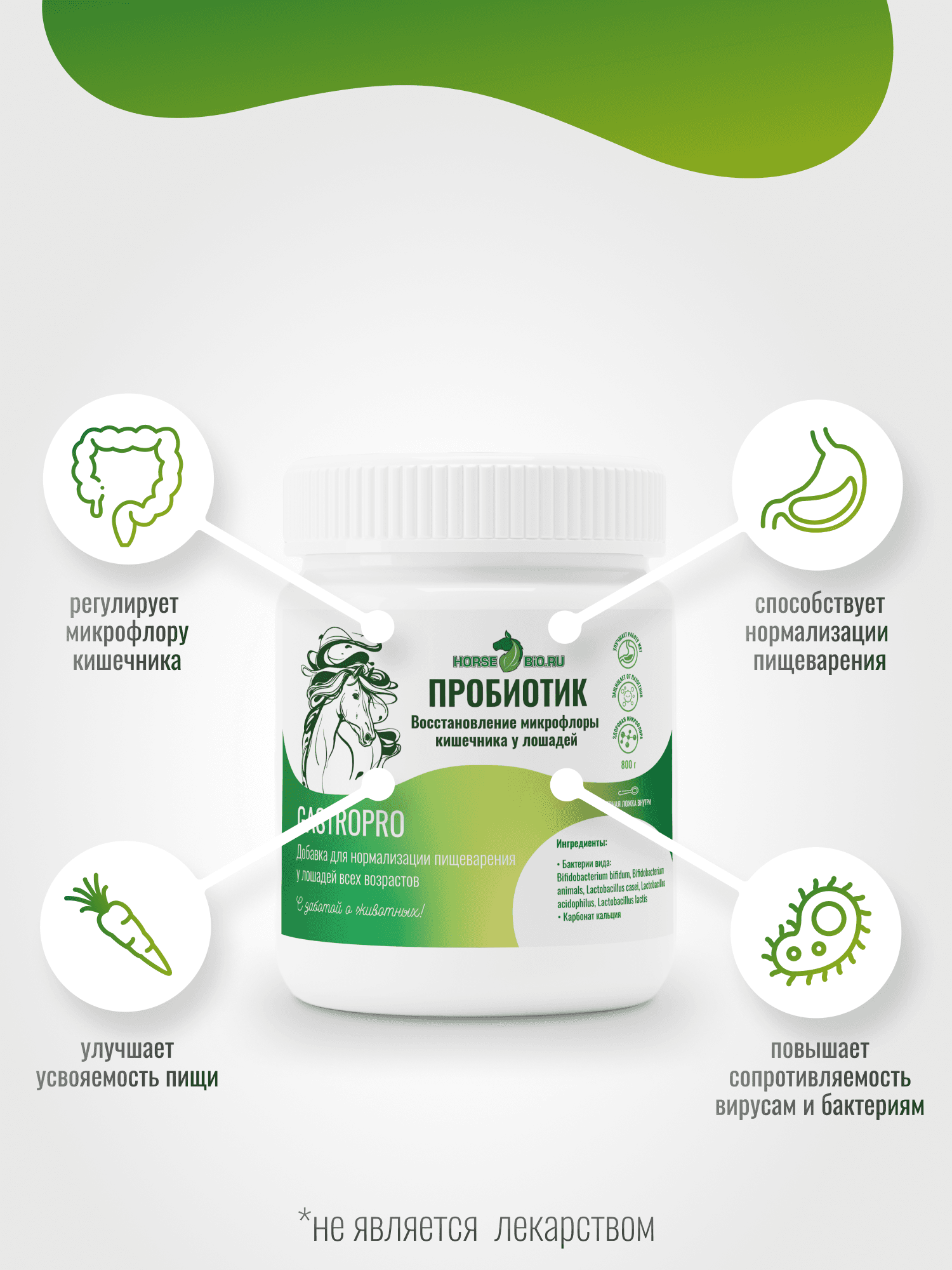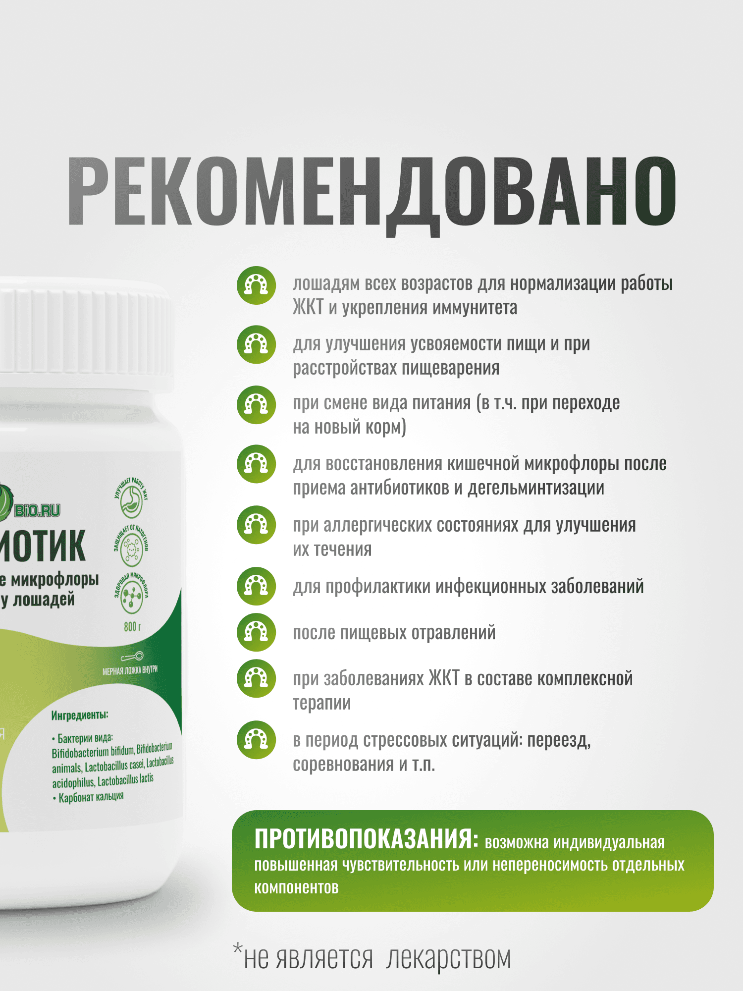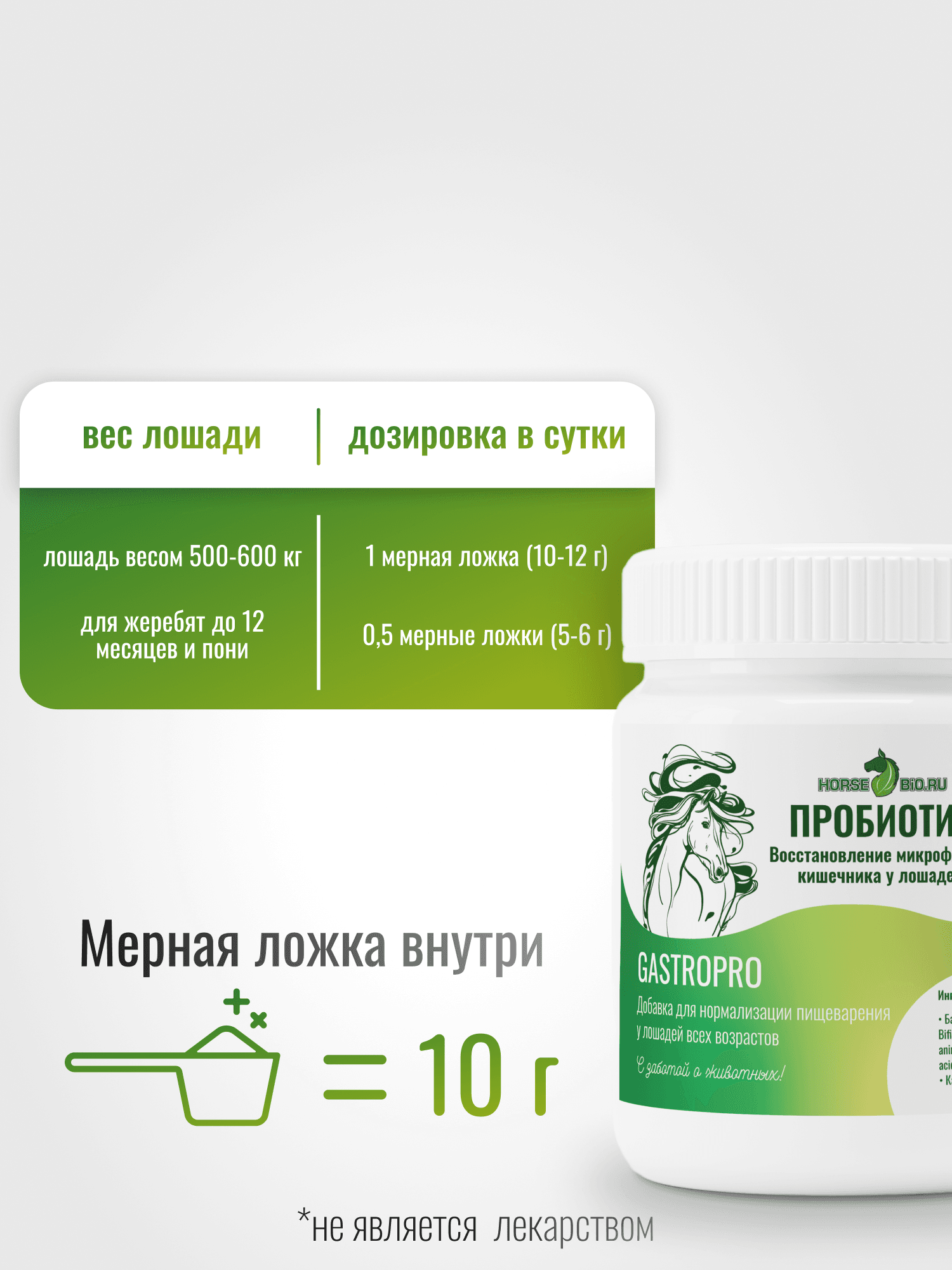 Пробиотик Horse-Bio GastroPro – это специализированная кормовая добавка, предназначенная для улучшения состояния здоровья и благополучия ваших лошадей. Подкормка содержит уникальную формулу, обогащённую пробиотиками, которые способствуют восстановлению микрофлоры кишечника и нормализации пищеварения. Эта добавка особенно полезна для лошадей после приема антибиотиков и дегельминтизации, в период стрессовых ситуаций: смена корма, переезд, соревнования и т.п., а также для тех, у кого имеется аллергия. Пробиотик работает на укрепление иммунитета, что жизненно важно для поддержания здоровья животных в различных условиях, включая спортивные нагрузки. Благодаря кальцию в составе эта подкормка идеально подходит для жеребят, способствуя их росту и развитию, а также для пожилых ослабленных лошадей для их поддержания. Подкормка представлена в удобной упаковке с мерной ложкой в комплекте, весом 800 г. Необходимую дозировку легко определить в зависимости от веса и потребностей вашей лошади, что делает данный продукт универсальным и удобным в использовании. Специализированные компоненты подходят для регулярного применения, помогая вашим животным оставаться в отличной физической форме и обеспечивая их долгосрочное благополучие. Хотите видеть свою лошадь бодрой и здоровой? Пробиотик Horse-Bio GastroPro - это современное решение для хорошего пищеварения, крепкого иммунитета и общего тонуса вашего скакуна!