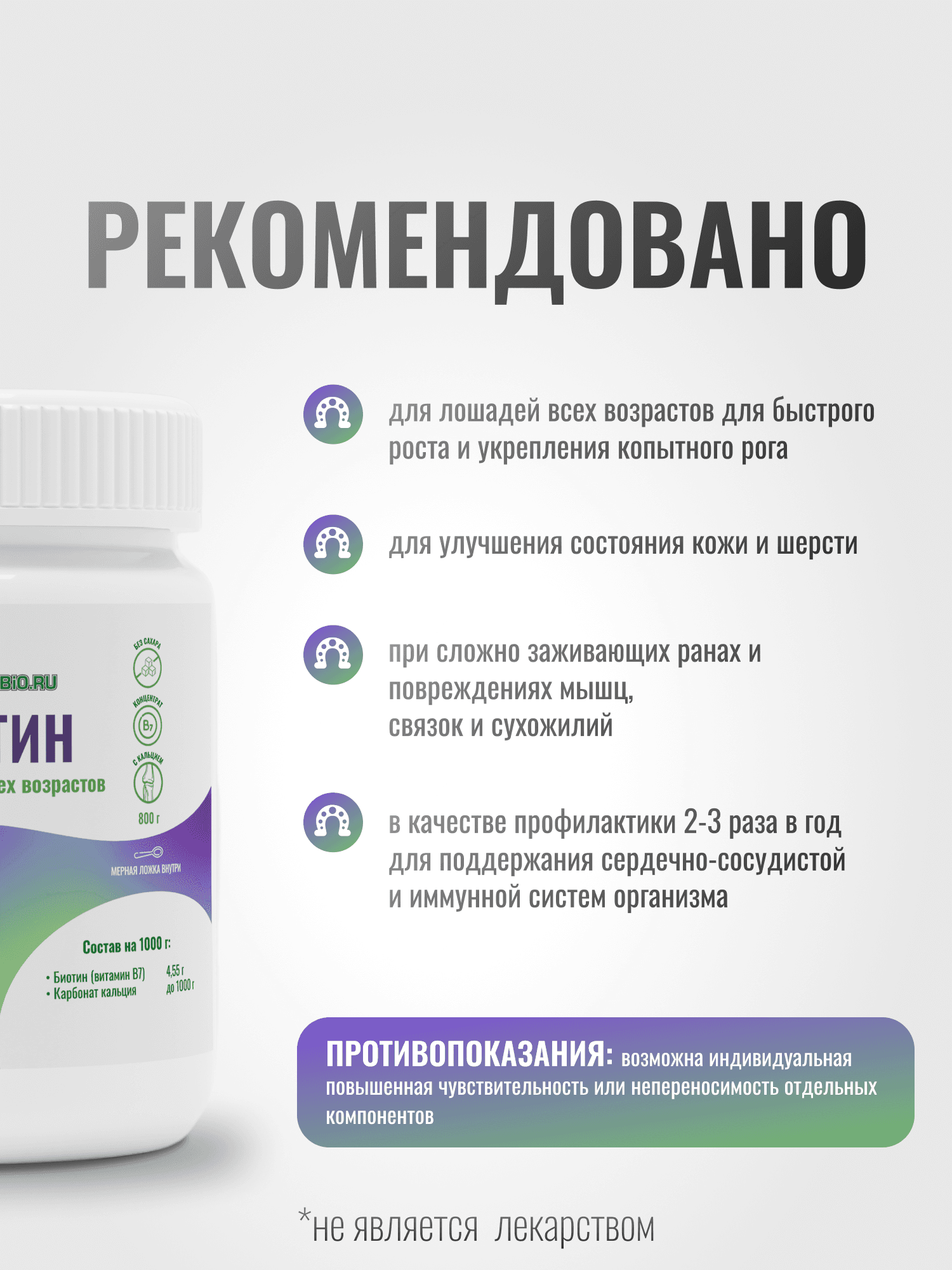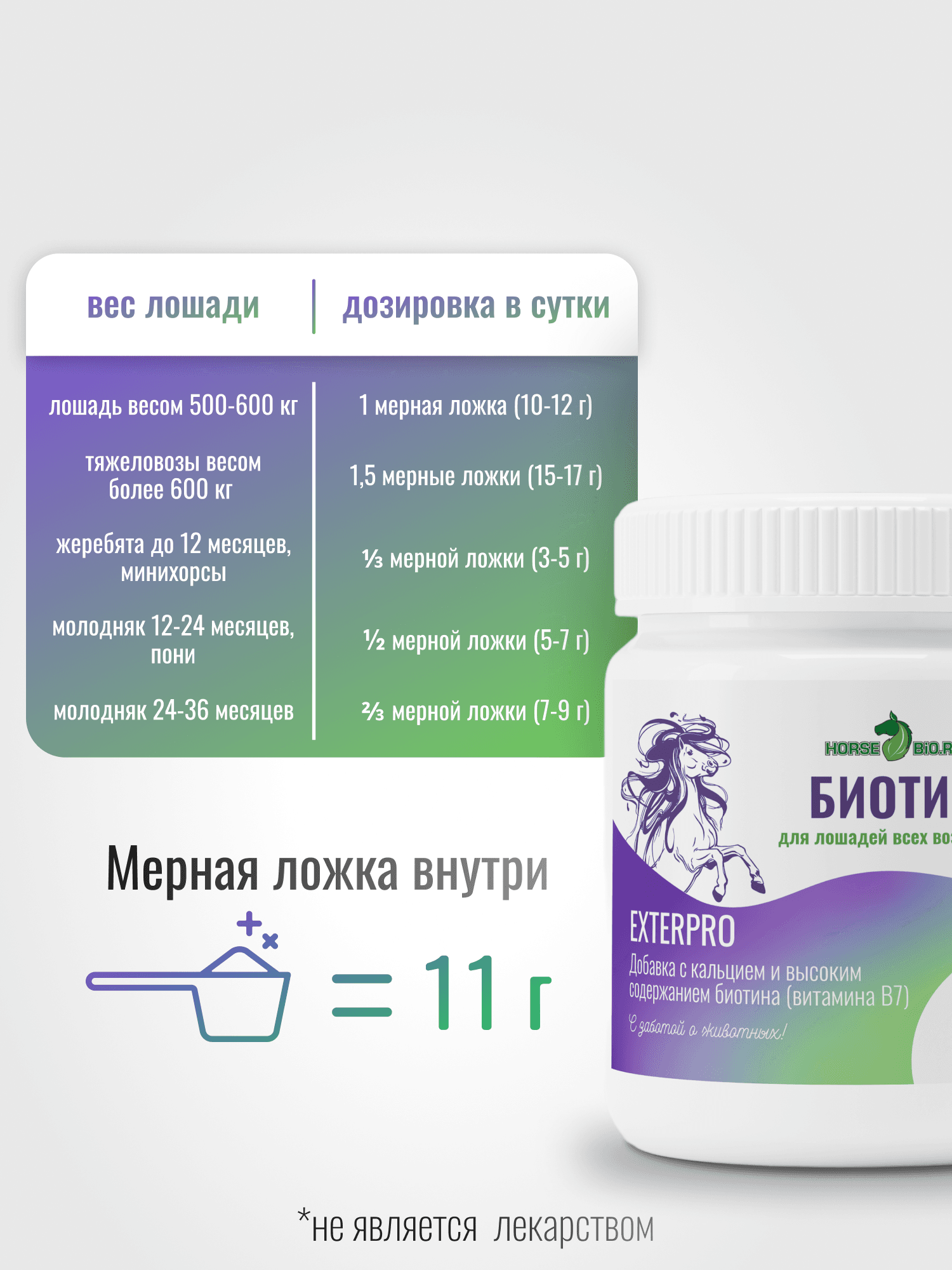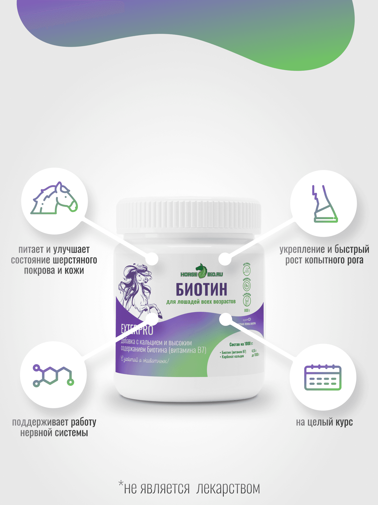 Биотин Horse-Bio ExterPro – это специализированная кормовая добавка, предназначенная для улучшения состояния здоровья и благополучия ваших лошадей. Подкормка содержит высокую концентрацию биотина, который способствует укреплению и быстрому росту копытного рога, повышая его устойчивость к внешним воздействиям. Эта добавка особенно полезна для спортивных и рабочих лошадей – для укрепления копыт при повышенных нагрузках и профилактики травм, а также жеребятам и молодым лошадям – для правильного формирования копыт, костей и здорового роста. Биотин играет ключевую роль в обменных процессах организма, улучшает состояние кожи и шерсти, а также ускоряет регенерацию тканей, включая мышцы, связки и кожные покровы. Добавка поддерживает работу нервной системы, укрепляет иммунитет и снижает риск сердечно-сосудистых заболеваний за счет нормализации уровня липопротеинов. Подкормка представлена в удобной упаковке с мерной ложкой в комплекте, весом 800 г. Необходимую дозировку легко определить в зависимости от веса и потребностей вашей лошади, что делает данный продукт универсальным и удобным в использовании. Специализированные компоненты подходят для регулярного применения, помогая вашим животным оставаться в отличной форме и обеспечивая их долгосрочное благополучие. Хотите позаботиться о здоровье своей лошади? Биотин Horse-Bio ExterPro – это оптимальное решение для поддержания крепких копыт, блестящей шерсти и отличного самочувствия вашего скакуна на протяжении всей жизни!