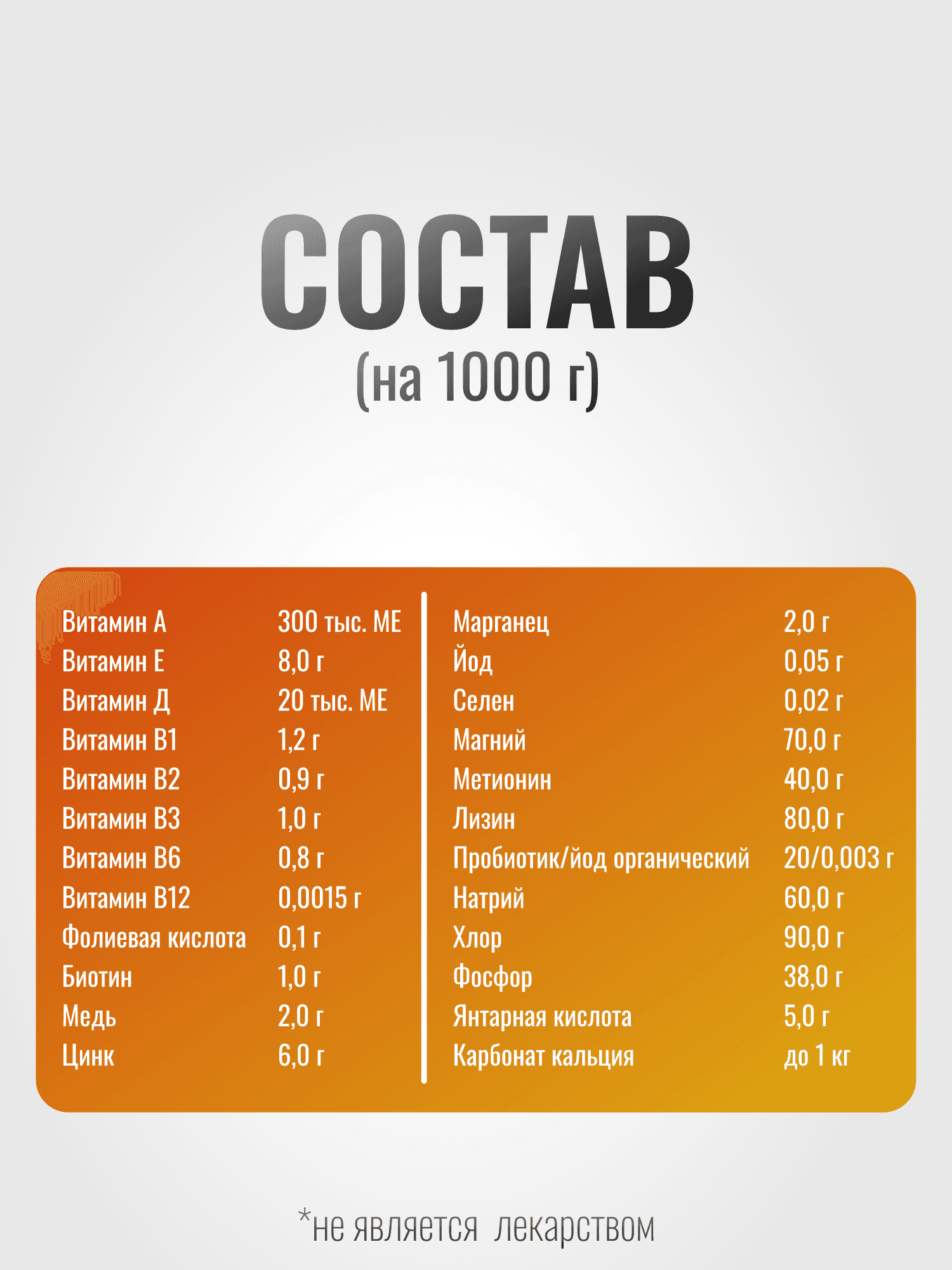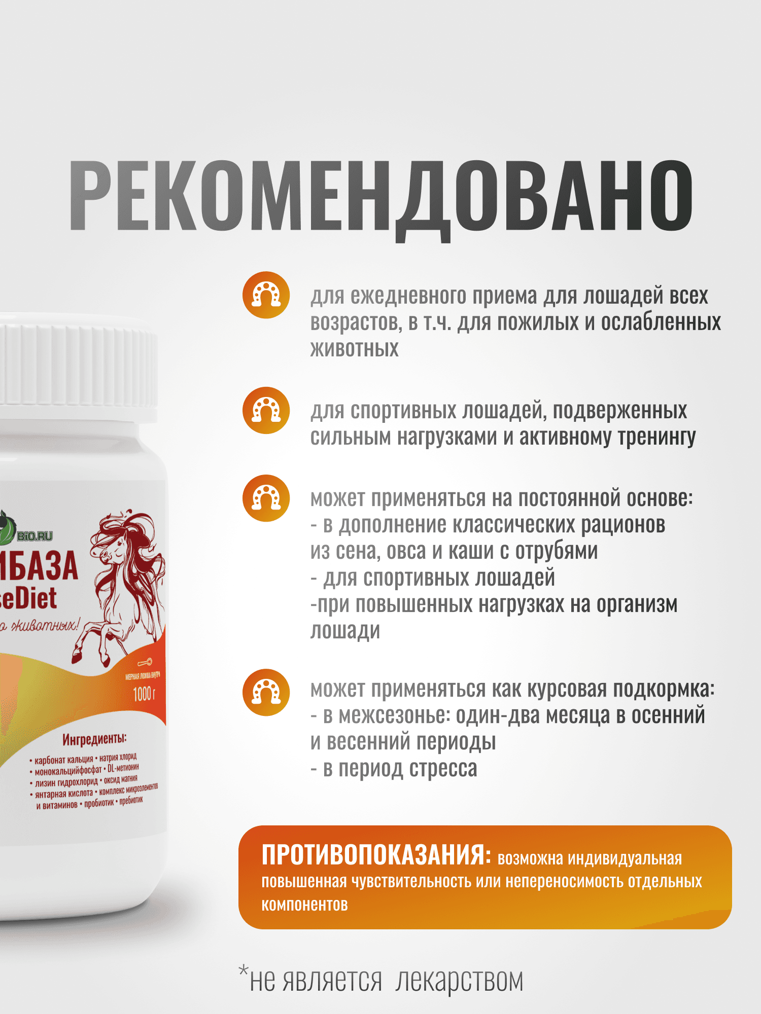 Действие: обогащает рацион питания необходимыми витаминами, аминокислотами, микро- и макроэлементами. Подходит для ежедневного приема для лошадей всех возрастов, в том числе для пожилых и ослабленных животных, поможет организму спортивных лошадей справиться с нагрузками и активным тренингом. Подкормка обогащает рацион незаменимыми аминокислотами, что позволяет организму синтезировать необходимые белки. Регулирует метаболизм. Содержит янтарную кислоту - уникальное органическое вещество, предотвращающее накопление свободных радикалов, и другие антиоксиданты и биологически активные вещества, поддерживающие организм при активной работе и способствующие повышению резистентности - сопротивляемости организма пагубному воздействию извне. Содержит микроэлементы, дефицитные в естественных кормах, важные для обменных процессов, иммунной системы, гемостаза, работы сухожильно-связочного аппарата, качества копытного рога и шерсти. Включенный в состав пробиотик способствует нормализации микробиоценоза и правильной работе желудочно-кишечного тракта. Комбинация неорганических и хелатных форм позволяет достичь эффективного усваивания нутриентов из добавки. Рекомендации: Может применяться на постоянной основе: в дополнение классических рационов из сена, овса и каши с отрубями; для спортивных лошадей; при повышенных нагрузках на организм лошади. Может применяться как курсовая подкормка: в межсезонье: один-два месяца в осенний и весенний периоды; в период стресса.