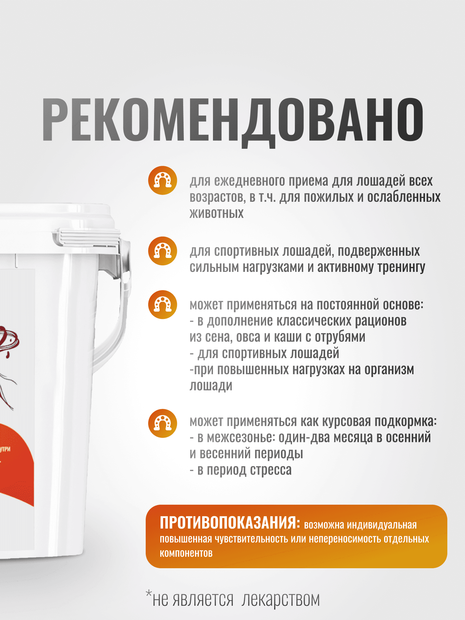 Действие: обогащает рацион питания необходимыми витаминами, аминокислотами, микро- и макроэлементами. Подходит для ежедневного приема для лошадей всех возрастов, в том числе для пожилых и ослабленных животных, поможет организму спортивных лошадей справиться с нагрузками и активным тренингом. Подкормка обогащает рацион незаменимыми аминокислотами, что позволяет организму синтезировать необходимые белки. Регулирует метаболизм. Содержит янтарную кислоту - уникальное органическое вещество, предотвращающее накопление свободных радикалов, и другие антиоксиданты и биологически активные вещества, поддерживающие организм при активной работе и способствующие повышению резистентности - сопротивляемости организма пагубному воздействию извне. Содержит микроэлементы, дефицитные в естественных кормах, важные для обменных процессов, иммунной системы, гемостаза, работы сухожильно-связочного аппарата, качества копытного рога и шерсти. Включенный в состав пробиотик способствует нормализации микробиоценоза и правильной работе желудочно-кишечного тракта. Комбинация неорганических и хелатных форм позволяет достичь эффективного усваивания нутриентов из добавки. Рекомендации: Может применяться на постоянной основе: в дополнение классических рационов из сена, овса и каши с отрубями; для спортивных лошадей; при повышенных нагрузках на организм лошади. Может применяться как курсовая подкормка: в межсезонье: один-два месяца в осенний и весенний периоды; в период стресса.