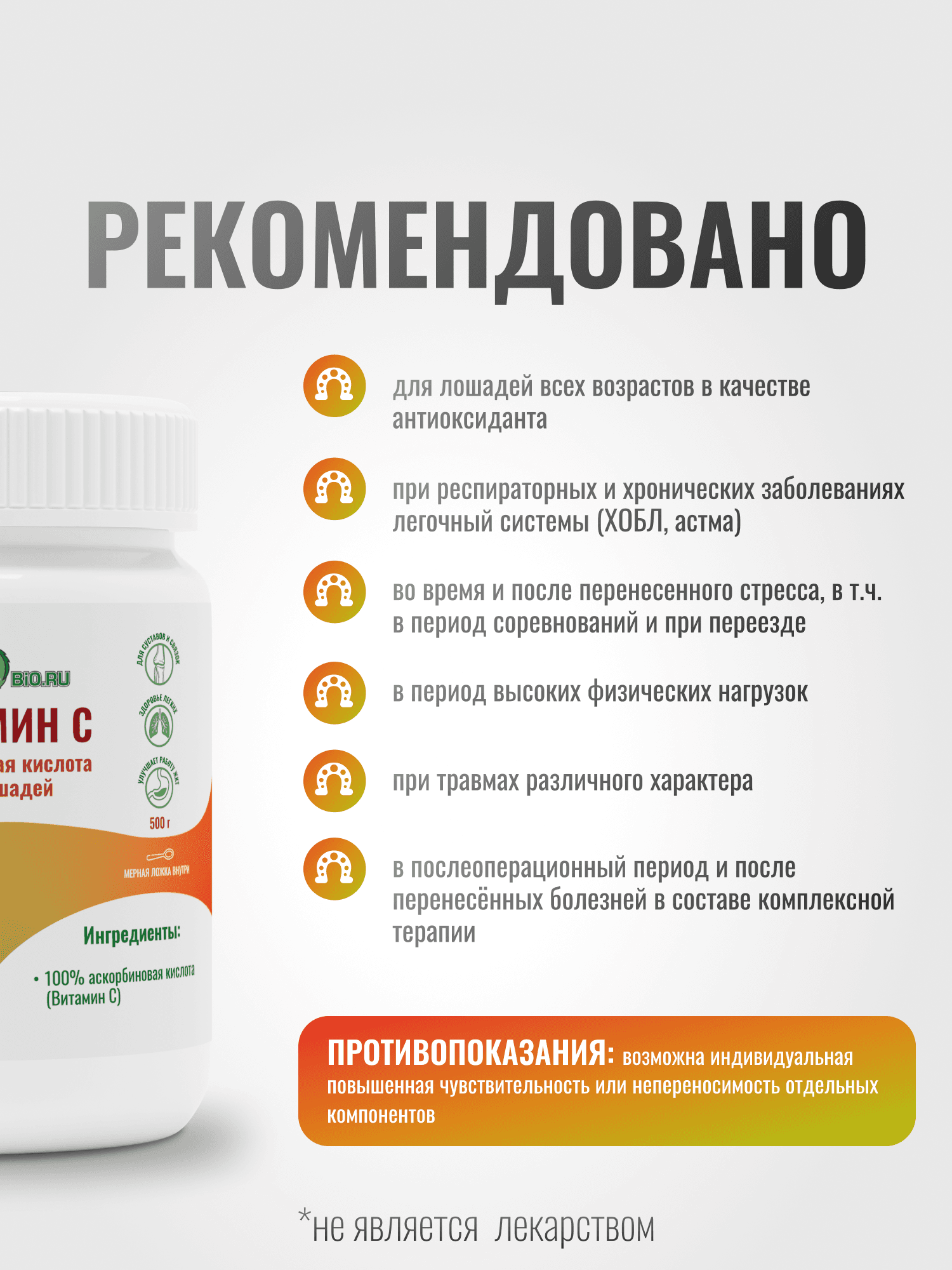 Действие: антиоксидант, защищает клетки организма от свободных радикалов, участвует в синтезе коллагена и помогает бороться с проблемами опорно-двигательного аппарата. Витамин С помогает легочной системе справляться с раздражением, вызванным пылью и аллергенами. Помогает бороться с аллергическими реакциями, не нарушая при этом защитных свойств иммунной системы. Ускоряет заживление ран и восстановление после операций. Благотворно воздействует на ЖКТ (в т.ч. при гастрите и язве желудка), защищая слизистую оболочку желудка от свободных радикалов, и гасит каскад воспалительных реакций. Повышает кислотность мочи, помогая выведению почечных камней и песка. Рекомендовано: для лошадей всех возрастов в качестве антиоксиданта; при респираторных и хронических заболеваниях легочный системы ХОЛ, астма); во время и после перенесенного стресса, в т.ч. в период соревнований и при переезде; в период высоких физических нагрузок; при травмах различного характера; в послеоперационный период и после перенесённых болезней; при хронических заболеваниях опорно-двигательного аппарата (артрит, артроз, и т.п.): при аллергических реакциях, в т.ч. при оксидативном стрессе; при гастрите, язве и других проблемах ЖКТ; при заболеваниях органов мочевыделения (почечные камни и .т.п.) для повышения кислотности мочи (выводит рН мочи в кислую область): при ламините; пожилым лошадям, в т.ч. при сниженном иммунитете, синдроме Кушинга и отсутствии возможности выпаса; для всех типов лошадей в качестве профилактики 2-3 раза в год.