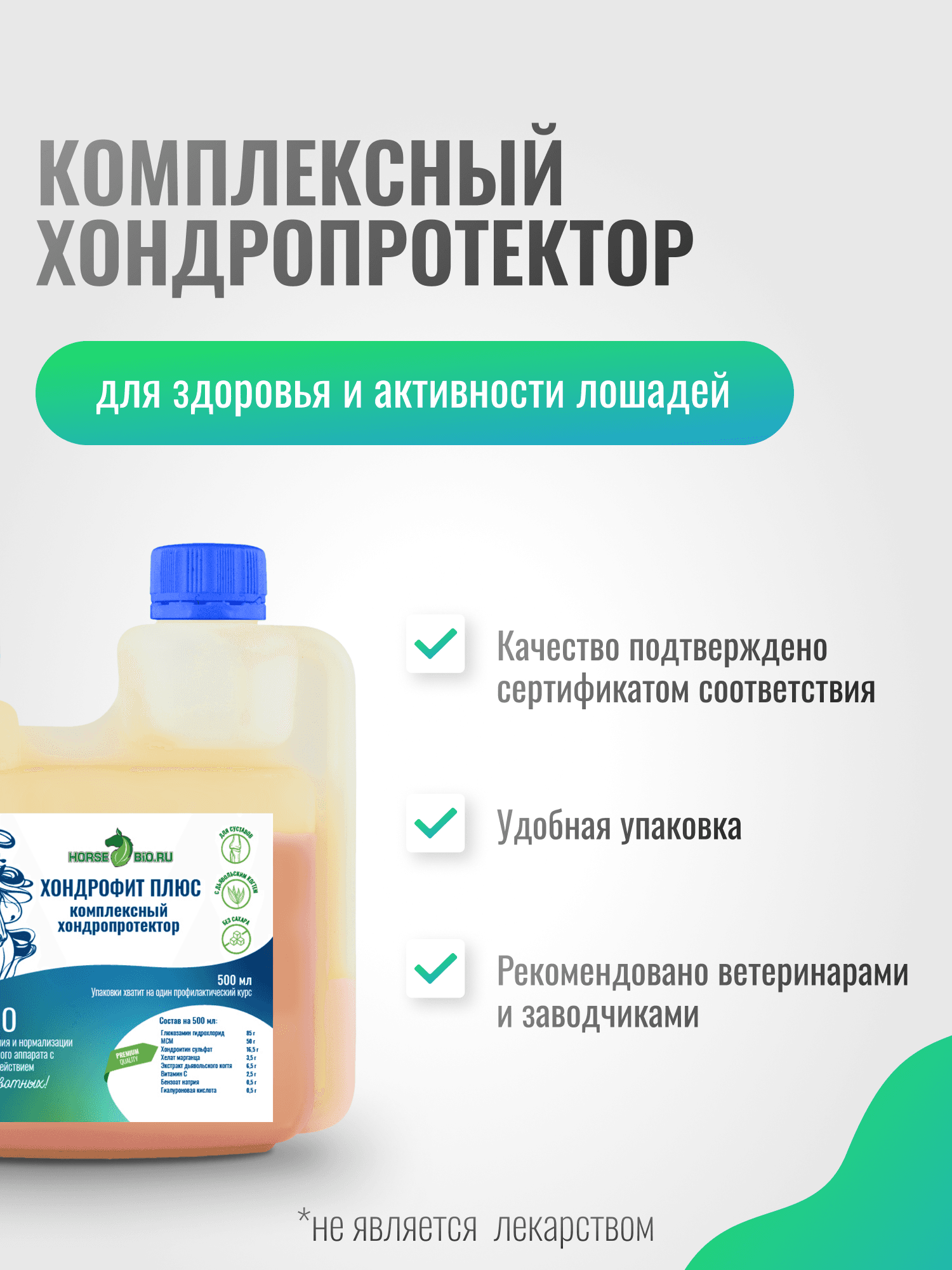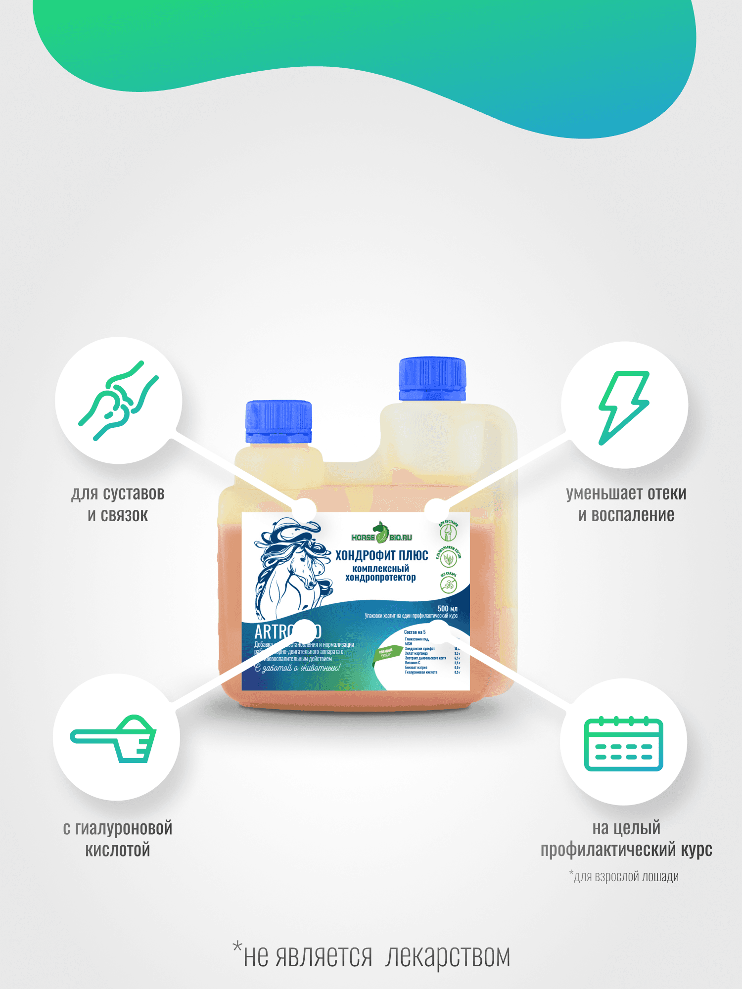 Позаботьтесь о здоровье вашего верного скакуна с Хондропротектором для лошадей — Хондрофит Плюс. Эта специально разработанная кормовая добавка поможет поддерживать здоровье опорно-двигательного аппарата, суставов и связок вашей лошади. В состав входят проверенные компоненты, такие как хондроитин, глюкозамин, гиалуроновая кислота и экстракт дьявольского когтя, которые способствуют восстановлению хрящевой ткани и уменьшению болезненности суставов. Формула данной добавки не только укрепляет суставы, но и обеспечивает профилактику различных заболеваний опорно-двигательной системы. Хондрофит Плюс станет отличным помощником для лошадей, ведущих активный образ жизни, подверженных нагрузкам из-за интенсивных тренировок. Поддержание нормального состояния суставов и связок особенно важено для лошадей и этот продукт создан именно для таких нужд. Хондрофит Плюс также поможет снизить воспаление и отечность, что является важным аспектом в уходе за лошадьми с проблемами опорно-двигательного аппарата. Он подходит для использования как в лечебных, так и в профилактических целях, позволяя не только улучшить качество жизни вашего скакуна, но и избежать серьезных заболеваний в будущем. Объем флакона составляет 500 мл, что обеспечивает достаточный запас продукта на один профилактический курс для взрослой лошади весом 500-600 кг и один лечебный курс для пони. Просто добавляйте нужное количество в корм, и она сможет наслаждаться активной и полноценной жизнью без болей и ограничений. Позаботьтесь о здоровье вашего скакуна, выбрав Хондрофит Плюс, который создан с учетом потребностей вашей лошади. Этот продукт разработан для того, чтобы помочь вашему питомцу чувствовать себя значительно лучше и оставаться активным на долгое время.