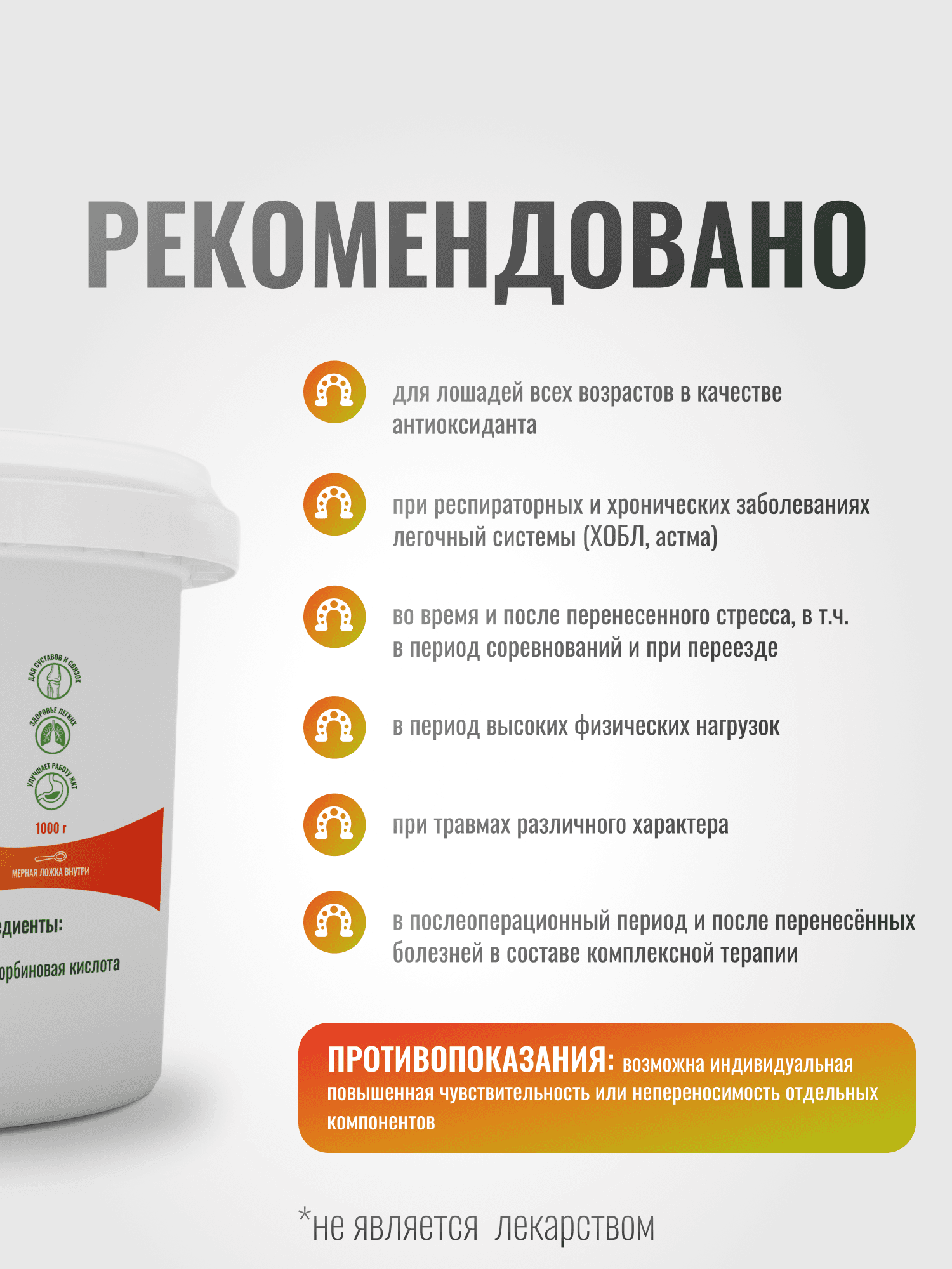 Действие: антиоксидант, защищает клетки организма от свободных радикалов, участвует в синтезе коллагена и помогает бороться с проблемами опорно-двигательного аппарата. Витамин С помогает легочной системе справляться с раздражением, вызванным пылью и аллергенами. Помогает бороться с аллергическими реакциями, не нарушая при этом защитных свойств иммунной системы. Ускоряет заживление ран и восстановление после операций. Благотворно воздействует на ЖКТ (в т.ч. при гастрите и язве желудка), защищая слизистую оболочку желудка от свободных радикалов, и гасит каскад воспалительных реакций. Повышает кислотность мочи, помогая выведению почечных камней и песка. Рекомендовано: для лошадей всех возрастов в качестве антиоксиданта; при респираторных и хронических заболеваниях легочный системы (ХОБЛ, астма); во время и после перенесенного стресса, в т.ч. в период соревнований и при переезде; в период высоких физических нагрузок; при травмах различного характера; в послеоперационный период и после перенесённых болезней; при хронических заболеваниях опорно-двигательного аппарата (артрит, артроз, и т.п.): при аллергических реакциях, в т.ч. при оксидативном стрессе; при гастрите, язве и других проблемах ЖКТ; при заболеваниях органов мочевыделения (почечные камни и .т.п.) для повышения кислотности мочи (выводит рН мочи в кислую область): при ламините; пожилым лошадям, в т.ч. при сниженном иммунитете, синдроме Кушинга и отсутствии возможности выпаса; для всех типов лошадей в качестве профилактики 2-3 раза в год.
