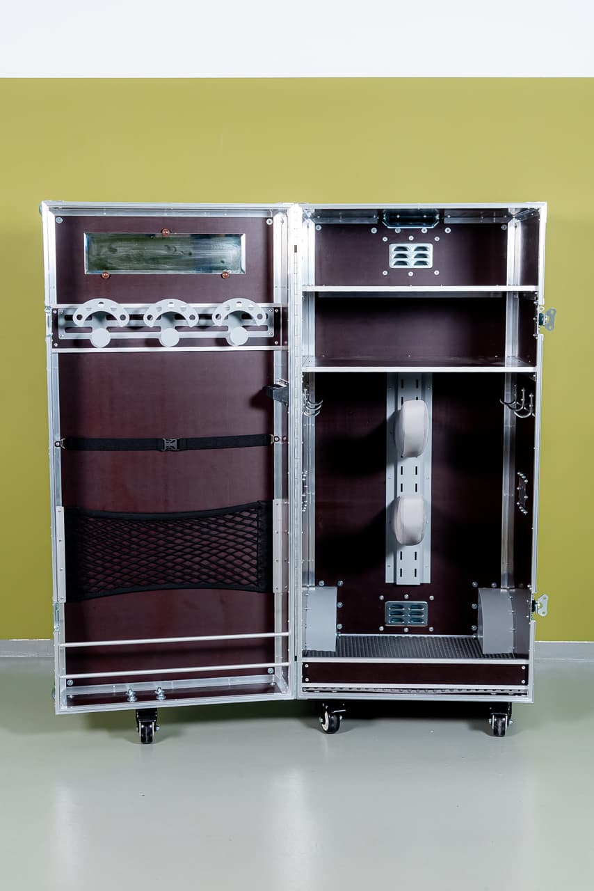Турнирный амуничник ( мобильный шкаф для седла) СИНГЛ размеры ширина 60см , высота 125 см, глубина 66см. Изготовлен из фурнитуры европейских производителей, каркас выполнен из алюминиевого профиля, заполнение водостойкой ламинированная фанера высшего сорта.
