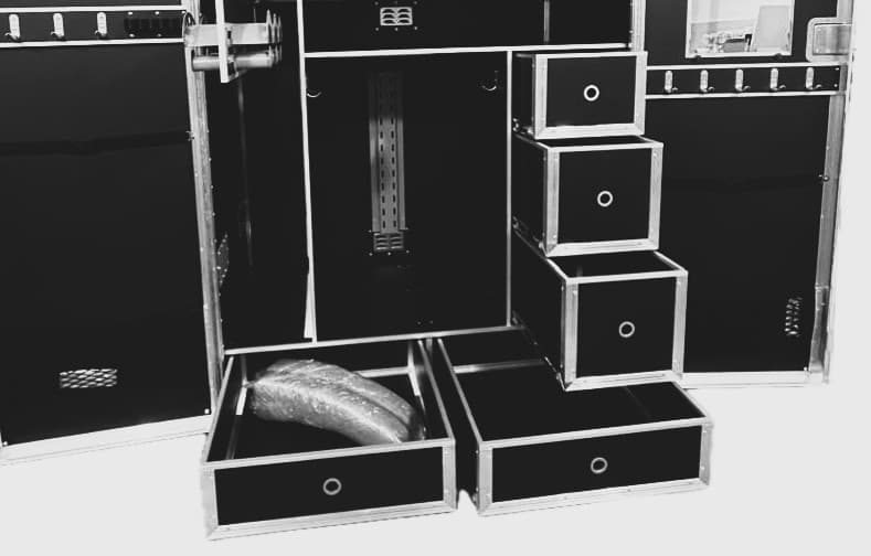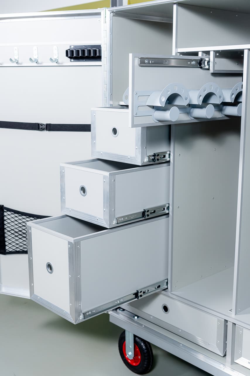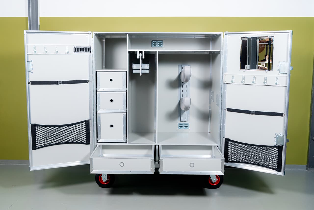 конкур 5 ящиков Мобильный амуничник для долговременных выездных соревнований и хранения амуниции в домашней конюшне. Оборудован необходимыми приспособлениями для комфортного размещения амуниции: выдвижные кронштейны для уздечек, регулируемые антивандальные кронштейы для сёдел, держатель хлыстов, выдвижные ящики разной ширины и глубины (нагрузка на каждый 25кг), сетчатые карманы, колёса повышенной грузоподъёмности, два из которых со стопором. Рымгайка для лебёдки. Амуничник закрывается на два замка, один из которых с ключом