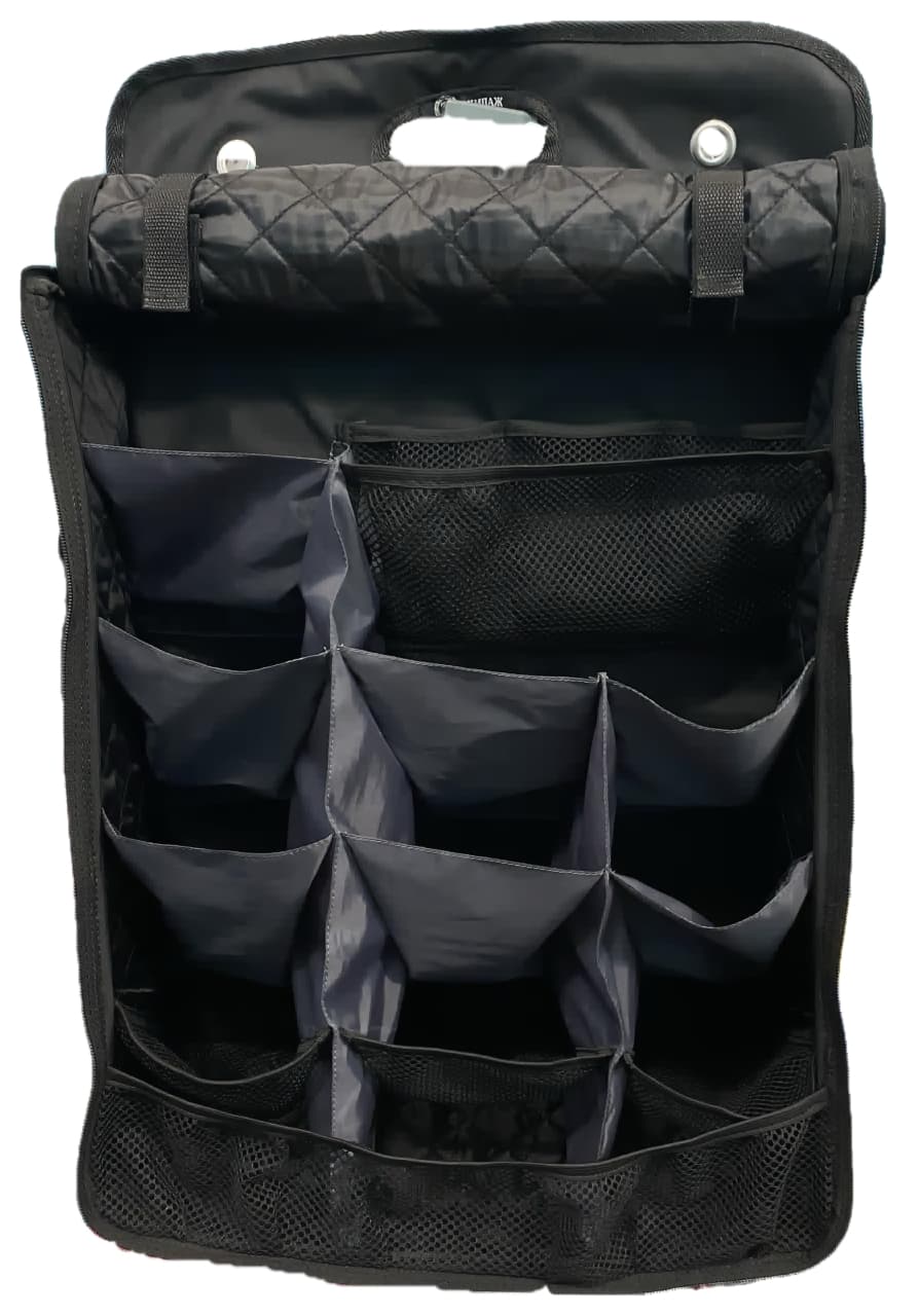 Органайзер выполнен из износостойкой ткани, усилен по задней стенке. Внутри имеет несколько карманов разной ширины, глубины и высоты. Передняя панель закрывается на усиленные молнии, в открытом положении фиксируется на липучке. Предназначен для хранения и комфортного использования при чистке и сборе лошади