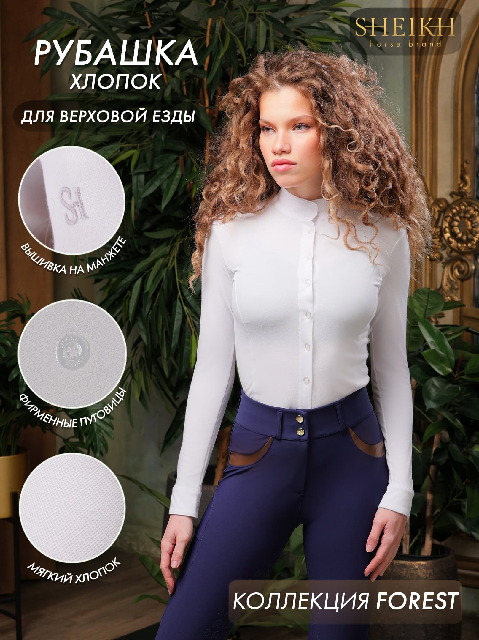 Рубашка для верховой езды от SHEIKH HORSE BRAND — идеальный союз комфорта, элегантности и функциональности Что делает её особенной? - Стрейч-ткань — рубашка "работает" вместе с вами, не сковывая движения ни в седле, ни за его пределами. - Лёгкий и дышащий материал — ощущение свежести даже в интенсивных тренировках. - Воротничок-стойка и утончённая вышивка на манжетах — изысканные детали, подчеркивающие ваш стиль. Эта модель универсальна: будь то тренировка в манеже или образ в духе old money для повседневной жизни Стиль верховой езды начинается с SHEIKH HORSE BRAND. Особенности: элегантная вышивка на манжете, фирменные пуговицы.