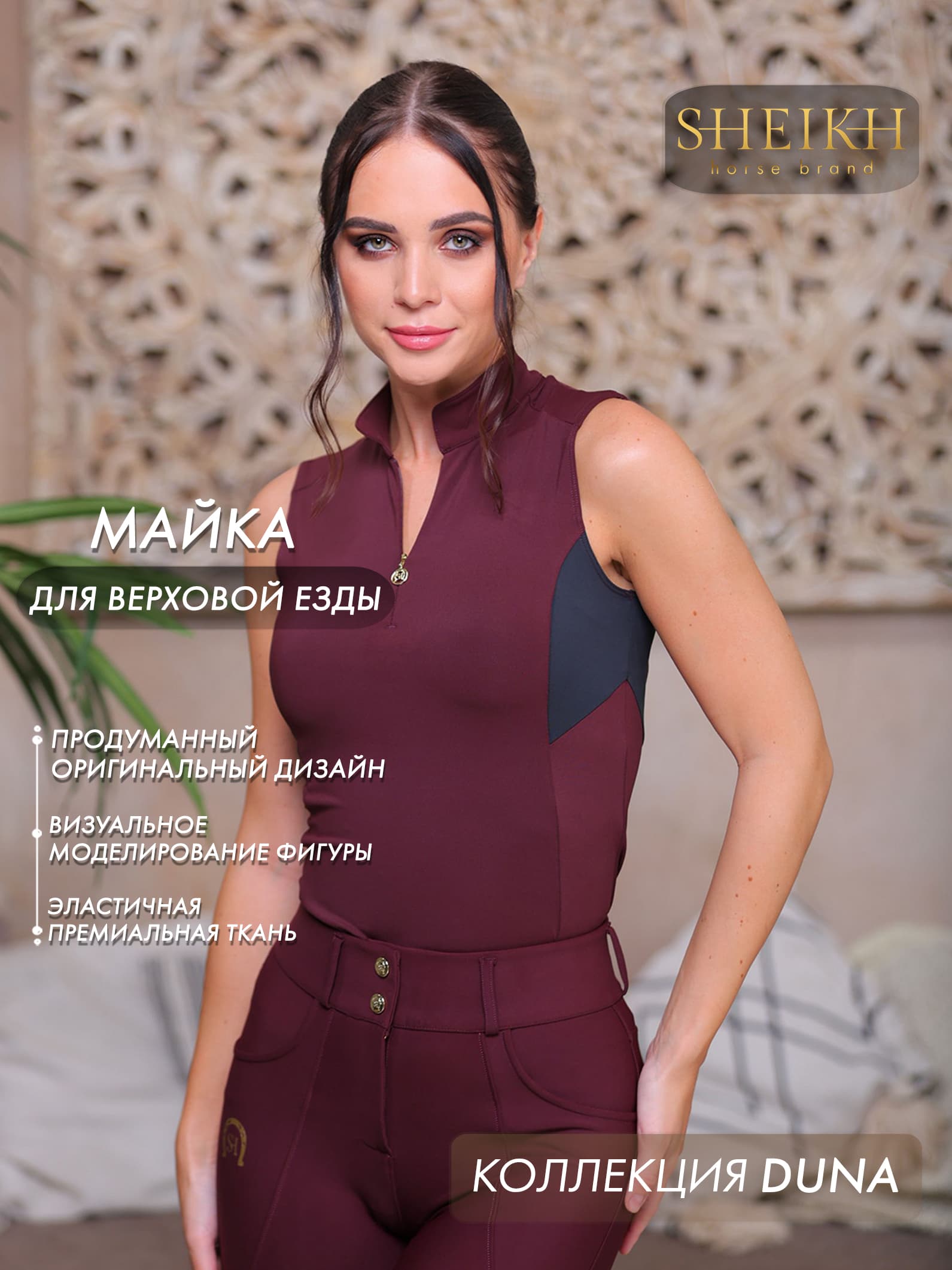 Майка для верховой езды, конного спорта Спортивная майка DUNE создана для того, что бы вы получили удовольствие от верховой езды в теплую и жаркую погоду. Мягкая, спортивная ткань быстро выводит влагу и приятна к телу. Отсутствие рукава позволит получить шикарный ровный заказ. Весь дизайн майки стремиться подчеркнуть ваш силуэт и элегантность линий. Скрытая молния дает свободу действий и выбора. Фирменная фурнитура с логотипом удобно ложился в руку. Каждая деталь подчеркивает вашу индивидуальность, особенность и трепетное отношение к себе. Вам обеспечен великолепный силуэт в седле с майкой от бренда SHEIKH . Детали: Майка изготовлена из спортивной ткани. Состав: 20% спандекс 80% полиэстер. Потайная молния. Фурнитура: латунь Брендирование на спине. Уход: Машинная стирка на деликатном режиме, при температуре не более 30С Сушка на открытом пространстве